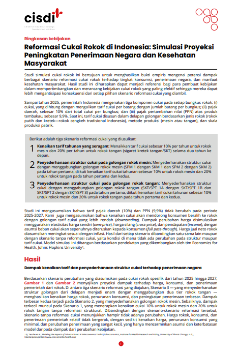 Studi ini menganalisis dampak reformasi sistem cukai rokok di Indonesia yang saat ini terdiri dari delapan lapisan, di mana kesenjangan harga mendorong praktik downtrading dan melemahkan tujuan fiskal serta kesehatan. Menggunakan model simulasi Tobacconomics (Johns Hopkins University), empat skenario untuk periode 2025–2027 dibandingkan, termasuk kenaikan cukai dengan dan tanpa penyederhanaan struktur. Hasilnya menunjukkan bahwa seluruh skenario reformasi lebih efektif dibandingkan status quo, dengan skenario terbaik kenaikan cukai disertai penyederhanaan lapisan rokok buatan tangan mampu meningkatkan penerimaan hingga 31% (±Rp60 triliun), menurunkan konsumsi 16% (±51 miliar batang), menekan prevalensi merokok dewasa 1,6%, serta mencegah sekitar 292.324 kematian dini. Temuan ini menegaskan pentingnya kombinasi kenaikan tarif dan simplifikasi struktur cukai untuk memaksimalkan dampak fiskal dan kesehatan.